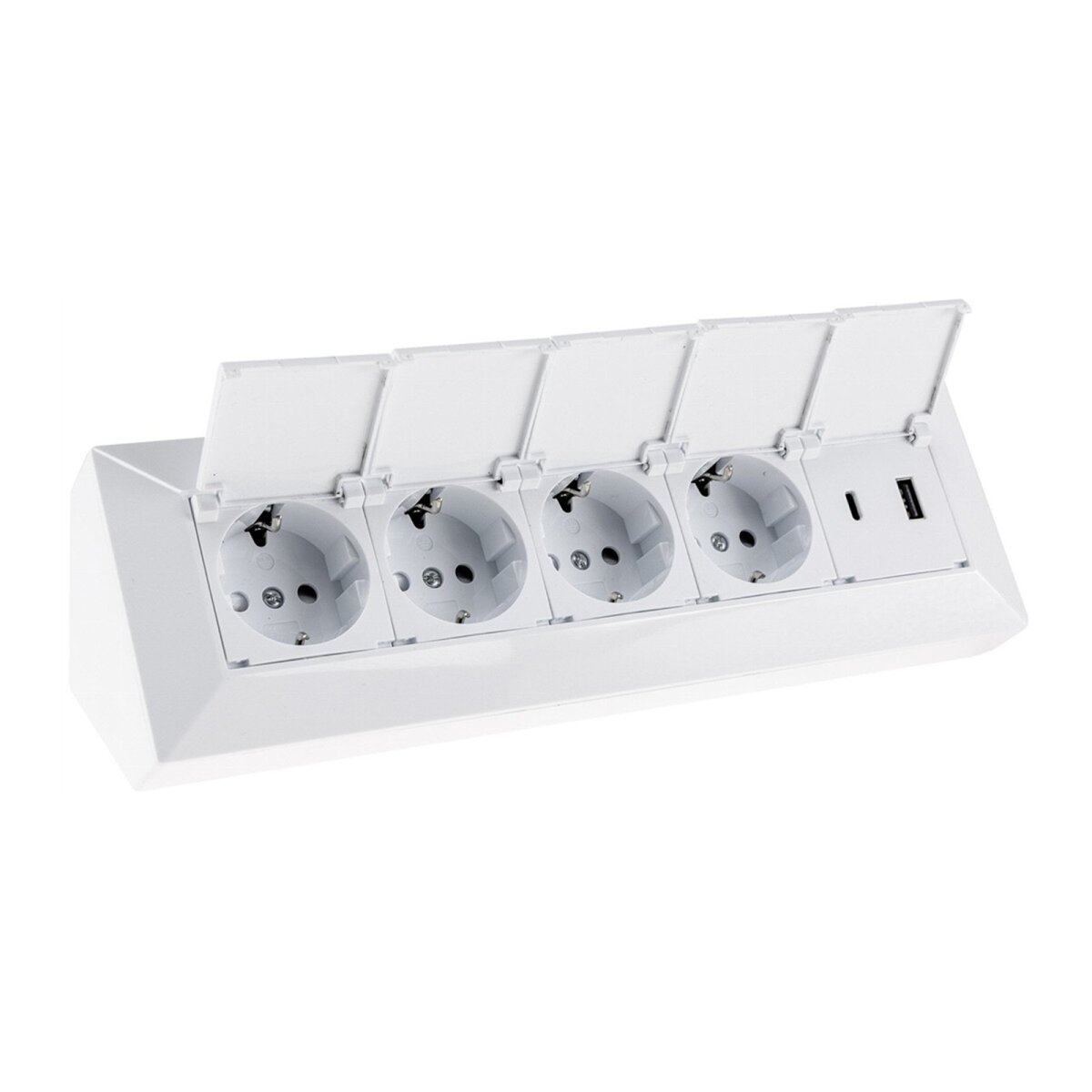 Der weiße 4-fach Steckdosenblock mit USB-A + USB-C vereint durchdachte Funktionalität mit modernem Design. Jede Steckdose ist mit einer separaten Abdeckklappe versehen und somit gemäß IP40 vor Staub geschützt – perfekt für den Einbau in Küchen, Werkbänken oder Arbeitsflächen.