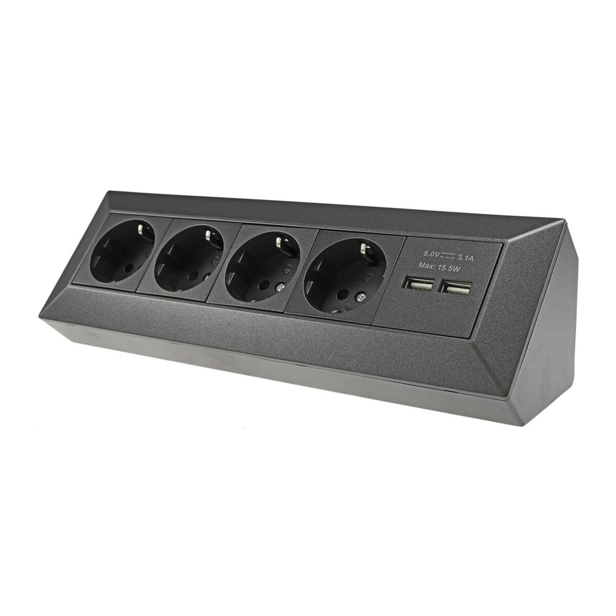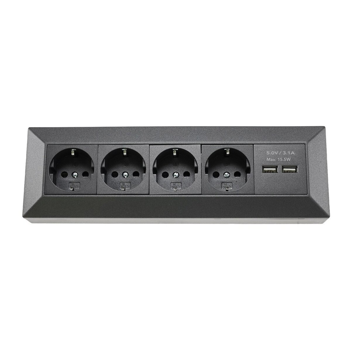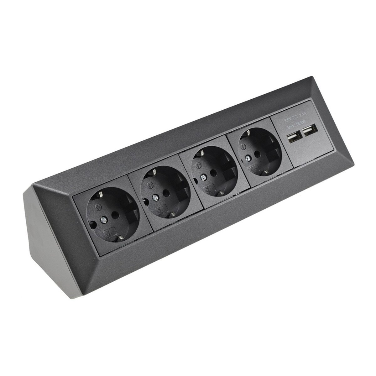 Der 4-fach Steckdosenblock mit 2 USB-Anschlüssen kombiniert Funktionalität und modernes Design. Das dreiwinklige Gehäuse ermöglicht eine optimale Platzierung auf Arbeitsflächen, in Ecken oder unter Küchenschränken. Die Steckdosen sind im Inneren bereits vorverkabelt, sodass die Montage schnell und einfach erfolgt.