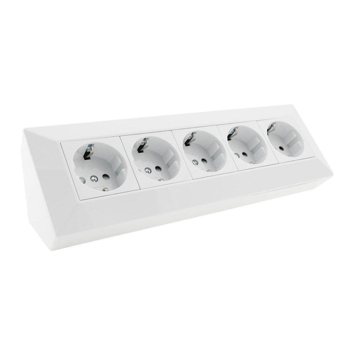 Der 5-fach Steckdosenblock in weiß ist eine vielseitige Steckdosenleiste mit 5 Schutzkontakt-Steckdosen. Dank des 45° gewinkelten Designs werden Steckplätze optimal ausgenutzt, was ihn besonders für die Installation in Ecken, auf Arbeitsflächen oder als Unterbausteckdose unter dem Küchenschrank geeignet macht. Das dreieckige Design sorgt für eine platzsparende Nutzung, ideal für Werkstätten oder Küchen. Der Metall-Innenrahmen garantiert Stabilität und Zugentlastung der Anschlussleitung.