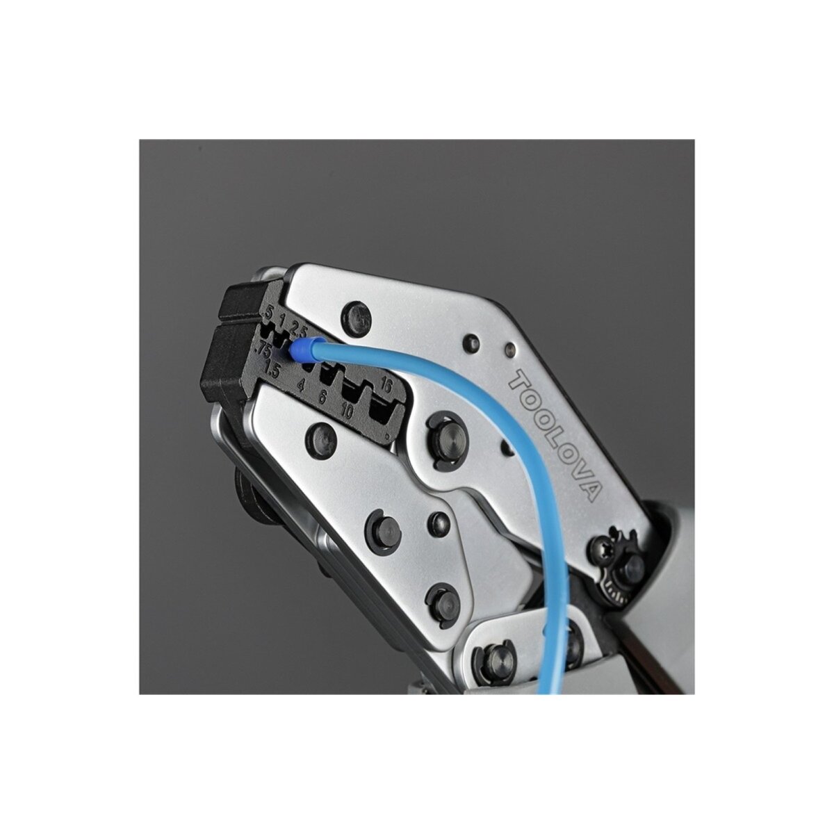 Mit dem TOOLOVA® Crimpwerkzeugset TF Plus erhalten Sie ein hochwertiges, langlebiges und vielseitiges Werkzeug, das speziell für professionelle Crimpaufgaben entwickelt wurde. Die wechselbaren Presseinsätze machen den Werkzeugkasten mit unzähligen Einzelzangen überflüssig. Das Industriequalität-geprüfte Crimpwerkzeug wurde auf 50.000 Verpressungen getestet und ist werkseitig kalibriert.