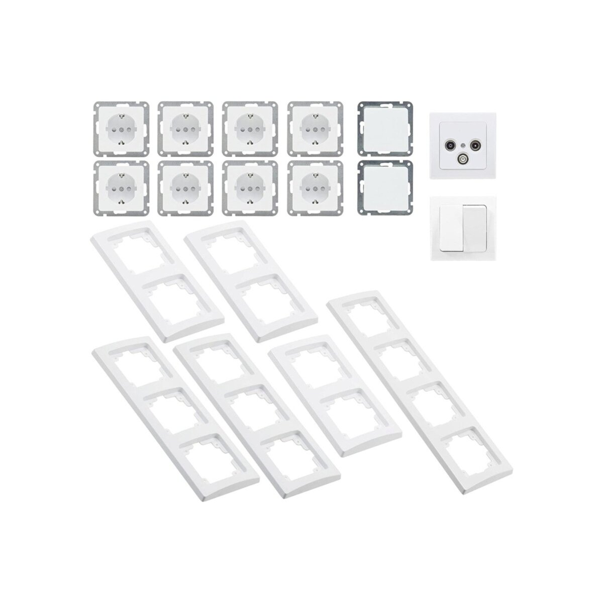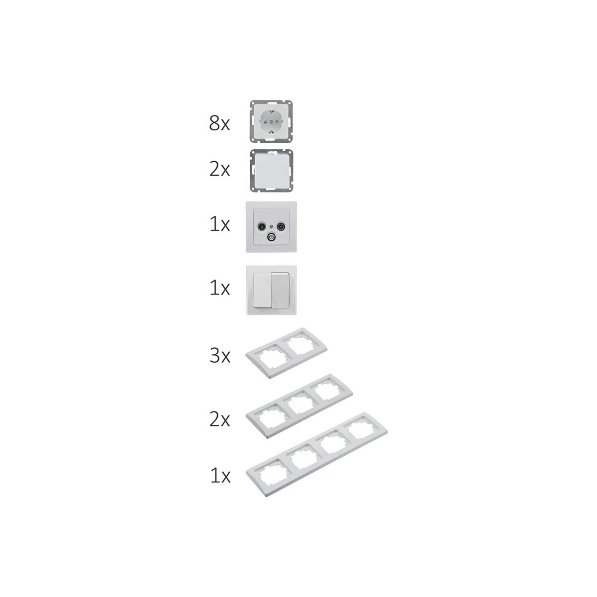 Komplett-Set mit den meistgebrauchten Komponenten für ihren Wohnraum. Set für Standard Unterputz Dosen, Wanddosen. Geeignet für Längs- und Quermontage, Vertikal und horizontal. Kombinierbar mir allen weiteren Komponenten der Delphi Serie.