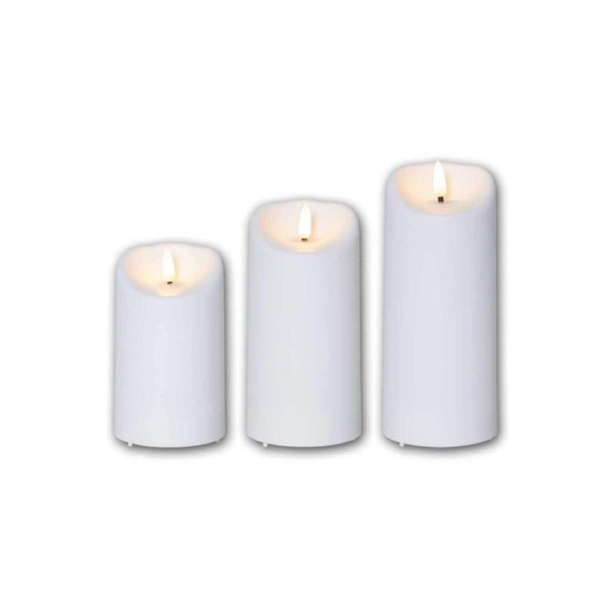 Schaffen Sie eine stimmungsvolle Lichtatmosphäre mit diesem LED-Kerzen Set, das aus drei verschiedenen Größen (13 cm, 15 cm & 18 cm Höhe) besteht. Die warmweiße LED-Flamme simuliert das sanfte Flackern echter Kerzen, ganz ohne Brandgefahr oder Wachsrückstände.