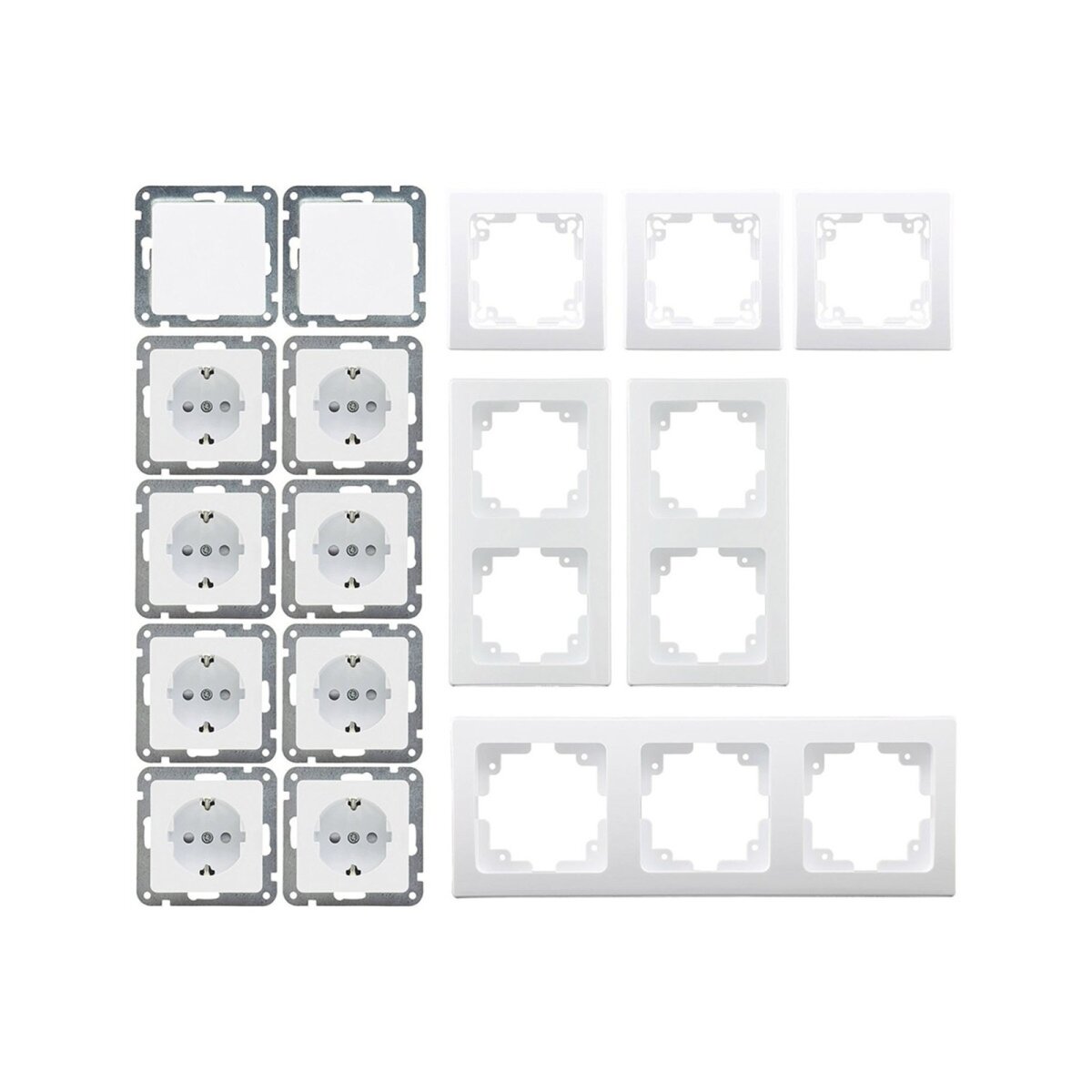 Das DELPHI Starter-Kit "PRO" in weiß bietet alles, was für eine hochwertige Elektroinstallation benötigt wird. Das Set enthält 8 Steckdosen (250V/16A) mit Klemmanschluss, 2 Wechsel-Schalter (250V/10A) ebenfalls mit Klemmanschluss, sowie Rahmen in verschiedenen Größen, um eine saubere und schnelle Montage zu ermöglichen. Ideal für Elektriker und den Masseneinbau. Die Steckdosen und Schalter sind für Längs- und Quermontage geeignet. Mit dem Klemmanschluss können die Komponenten schnell und ohne Schrauben montiert werden. Das Starter-Kit ist somit die perfekte Lösung für eine professionelle und zeitsparende Installation.