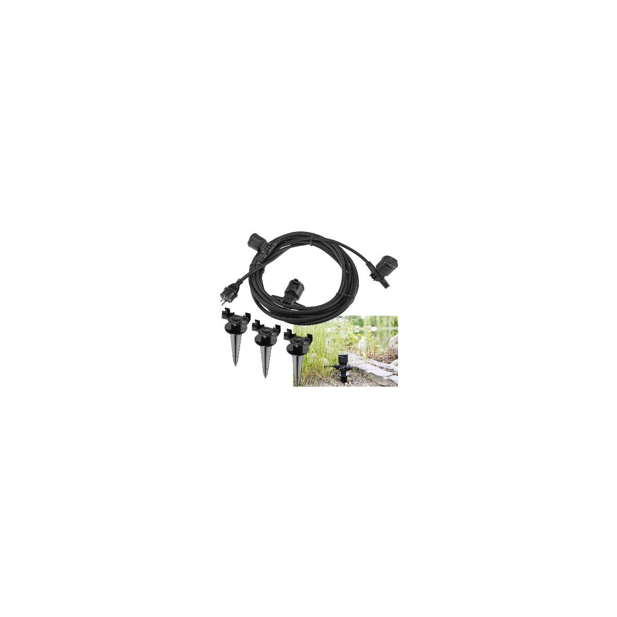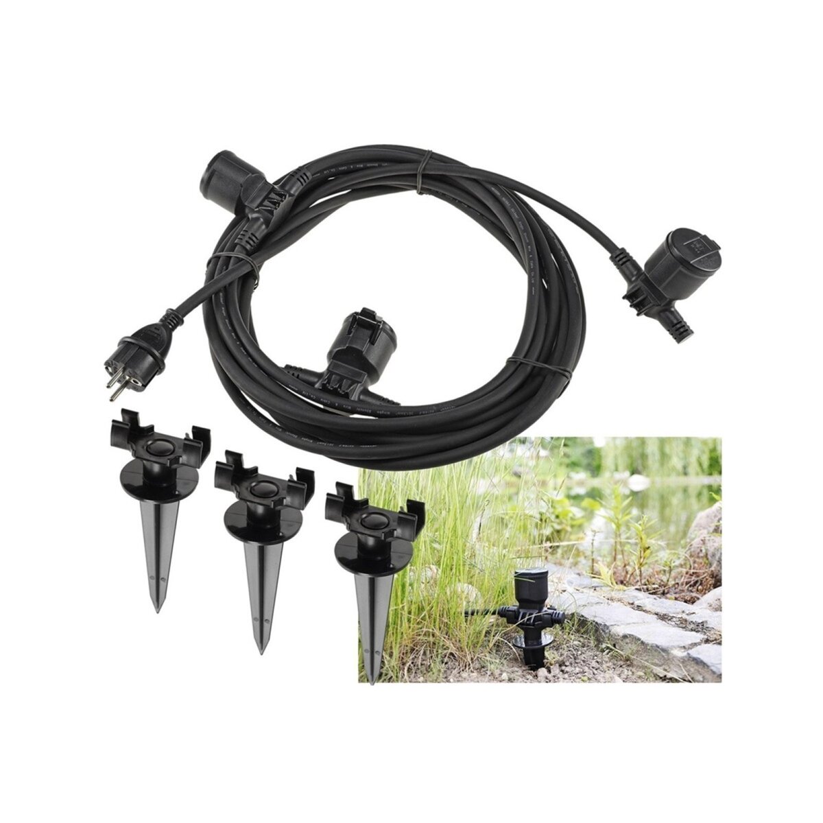 Die Gartensteckdose für Außen ist eine praktische Lösung für den Anschluss mehrerer Gartenleuchten oder elektrischer Geräte im Außenbereich. Mit einer Gesamtlänge von 10 Metern (5m + 2,5m + 2,5m) bietet sie flexible Einsatzmöglichkeiten. Die Steckdosenleiste ist mit 3 Schutzkontaktsteckdosen ausgestattet, die selbstschließende Deckel haben, um die Sicherheit zu erhöhen. Jeder Steckdosentopf ist mit einem Erdspieß ausgestattet, was eine stabile und sichere Verankerung im Boden ermöglicht. Die Steckdosenleiste ist IP44 zertifiziert, was sie spritzwassergeschützt macht und somit für den Einsatz im Garten oder rund um den Teich geeignet ist.
