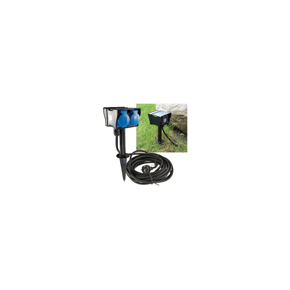 Die Steckdose ist für den Betrieb bei 230V und eine maximale Leistung von 3680W (16A) geeignet, wobei jede Steckdose maximal 8A aufnehmen kann. Der Gummi-Stecker sorgt für zusätzlichen Schutz und Langlebigkeit. Der Erdspieß mit einer Gesamthöhe von 360mm und einer Spießlänge von 150mm ermöglicht eine sichere und stabile Befestigung im Boden.