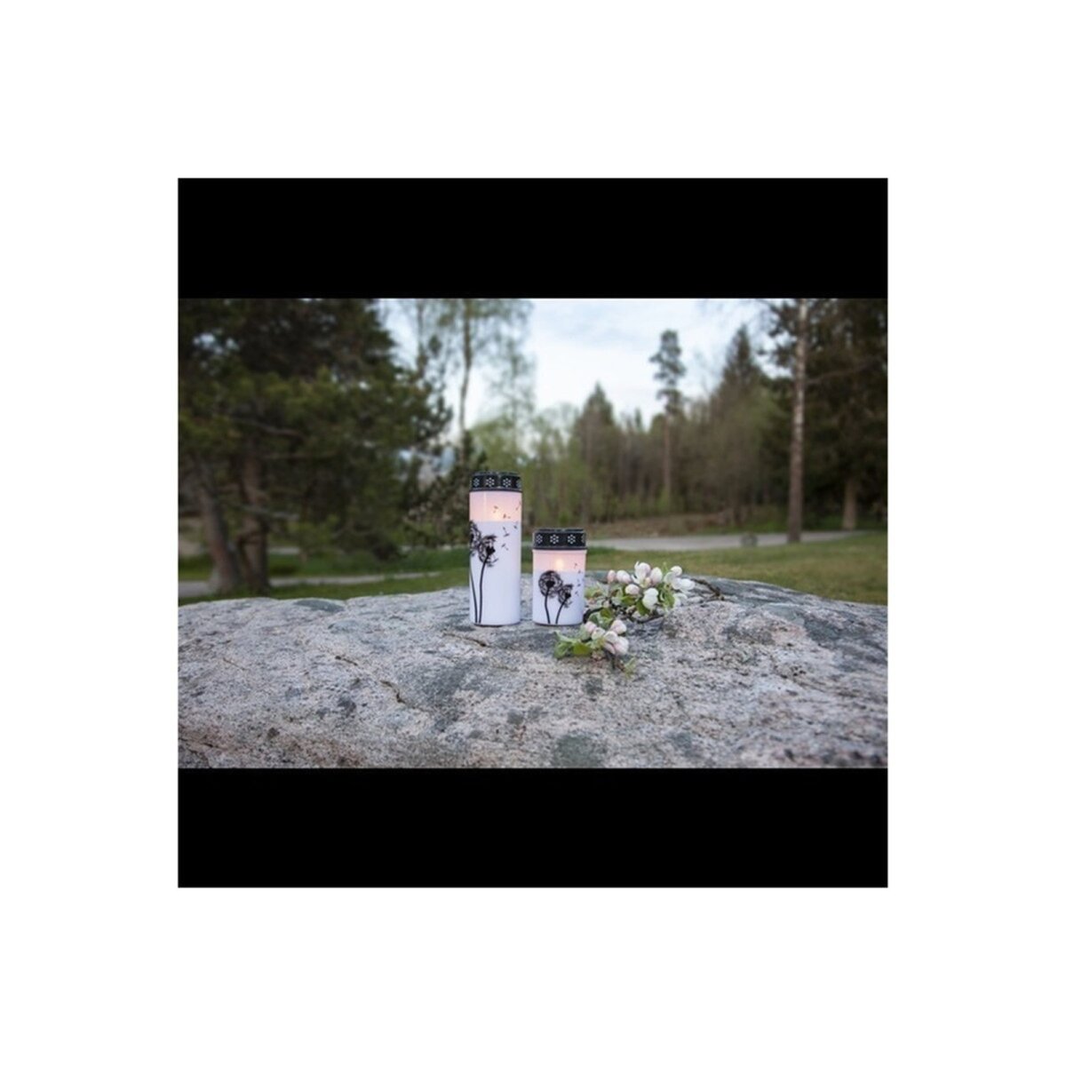 Das LED Grablicht „Dandelion“ ist eine geschmackvolle und wetterfeste Grabkerze für den Außenbereich. Die matte weiße Oberfläche ist mit einem filigranen Löwenzahnmotiv bedruckt, das sanft im Wind verfliegende Samen darstellt – ein Symbol für Erinnerung und Vergänglichkeit.