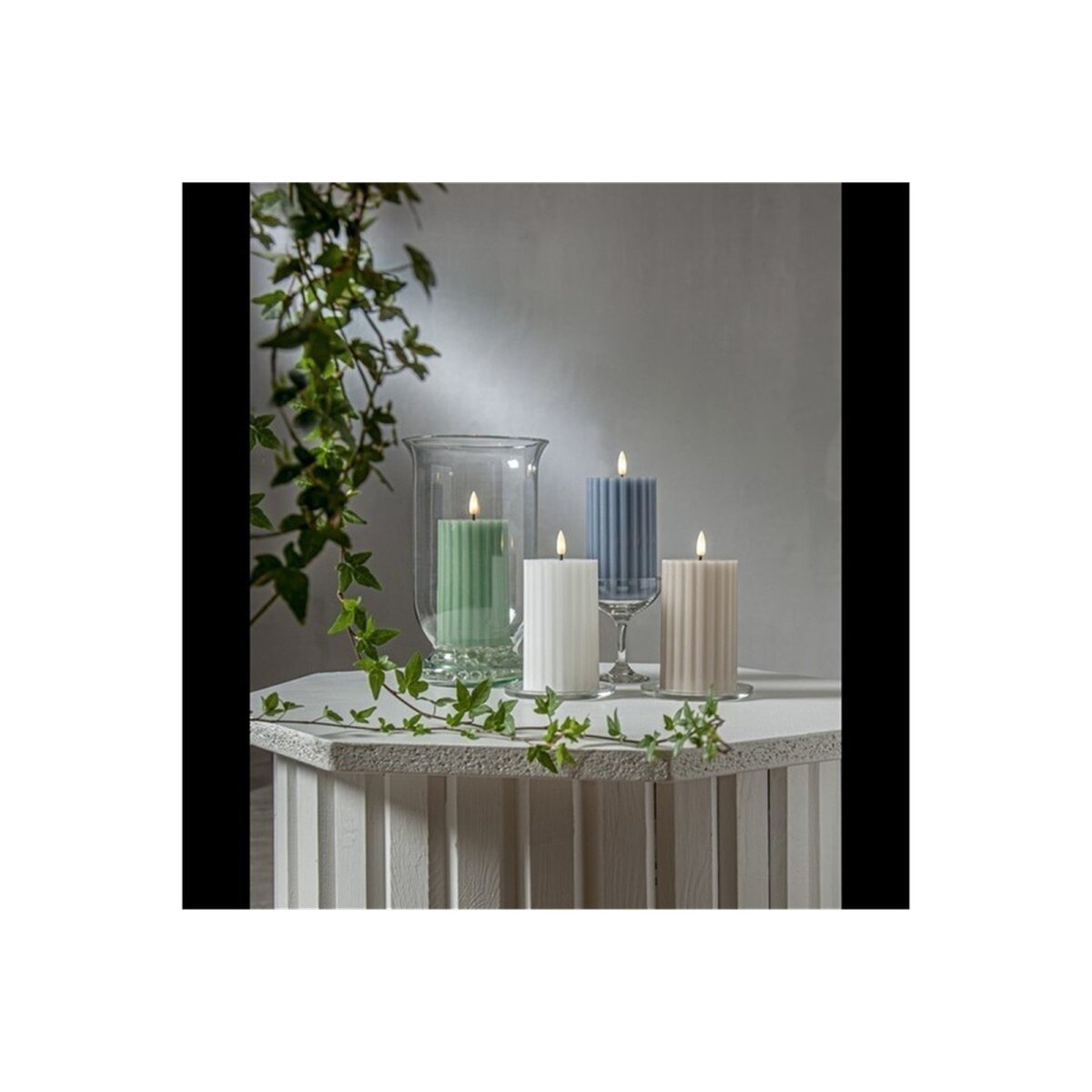 - 1× LED-Stumpenkerze „Flamme Stripe“ – 15 cm hoch, Weiß