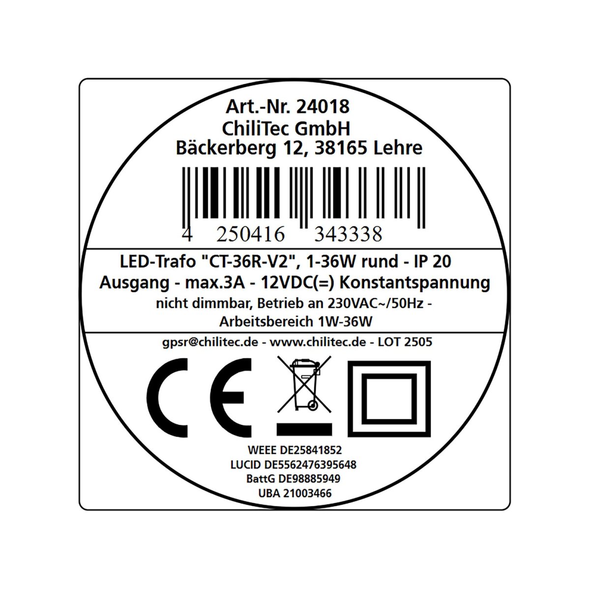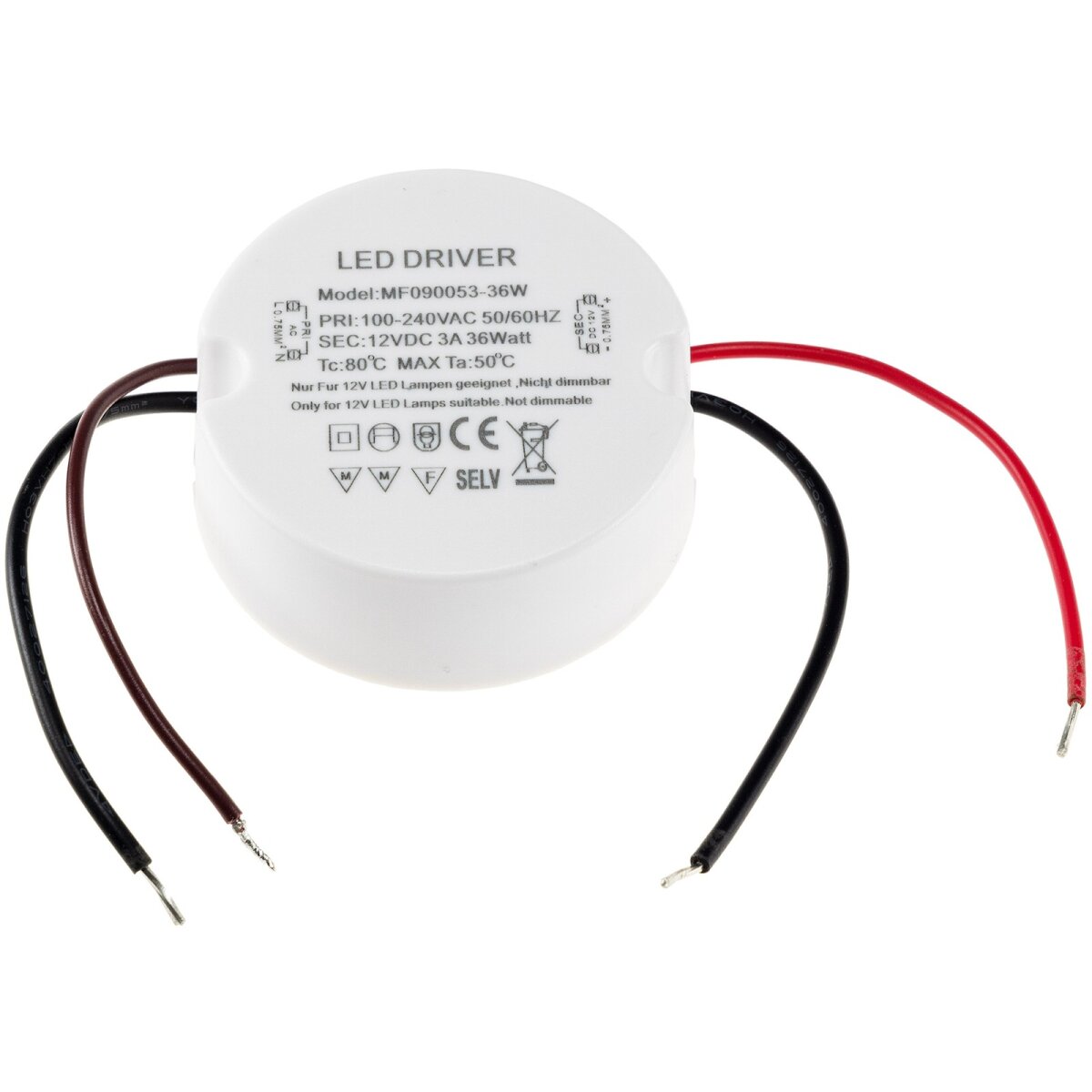 Der LED-Trafo CT-36E ist die ideale Stromversorgung für Ihre LED-Beleuchtung im Innenbereich. Mit seiner kompakten Bauform (Ø64 x 25 mm) lässt er sich platzsparend in Verteilerdosen und abgehängten Decken integrieren. Er liefert eine stabile 12V Gleichspannung und ist somit perfekt geeignet für LED-Strahler und LED-Stripes, die nicht mit herkömmlichen Halogentrafos betrieben werden können.