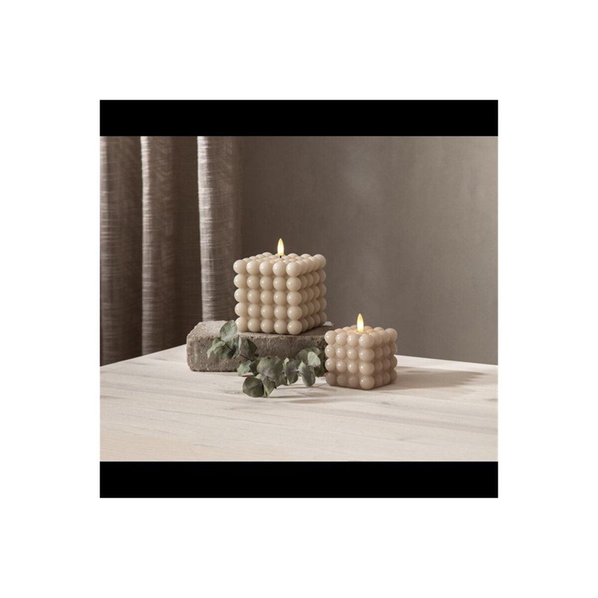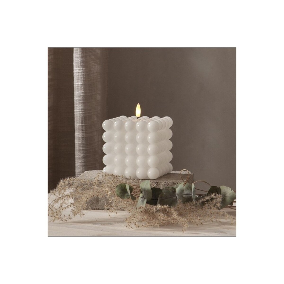 Die LED-Wachskerze Flamme Dot in Weiß begeistert mit ihrem modernen Bubble-Design und einer täuschend echten LED-Flamme in warmweißem Licht. Mit einer Größe von 12,5 cm Höhe und 10 × 10 cm Breite/Tiefe ist sie eine stilvolle Dekoration für den Innenbereich – ob einzeln oder in Kombination mit anderen Kerzen der Flamme-Serie.