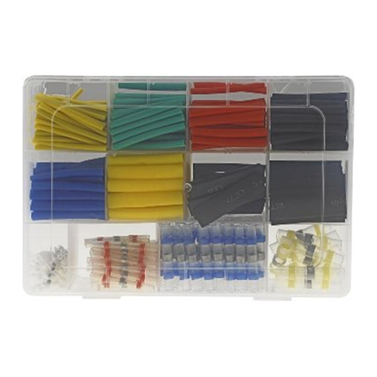 • Schrumpfschläuche: 50 Stück 2x45mm gelb, 40 Stück 3,5x45mm grün, 30 Stück 4x45mm rot, 30 Stück 4x45mm schwarz, 25 Stück 5x45mm blau, 25 Stück 6x45mm gelb, 20 Stück 7x45mm schwarz, 20 Stück 10x45mm schwarz
