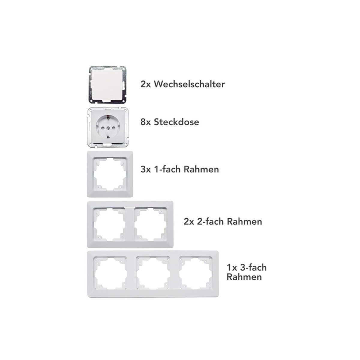 Dieses umfangreiche MILOS Starter-Set bietet alles, was Sie für eine moderne, saubere und schnelle Elektroinstallation benötigen. Mit 8 Steckdosen, 2 Schaltern und mehreren passenden Rahmen in Weiß Matt ist das Set sowohl für Neubauten als auch Renovierungen ideal geeignet.