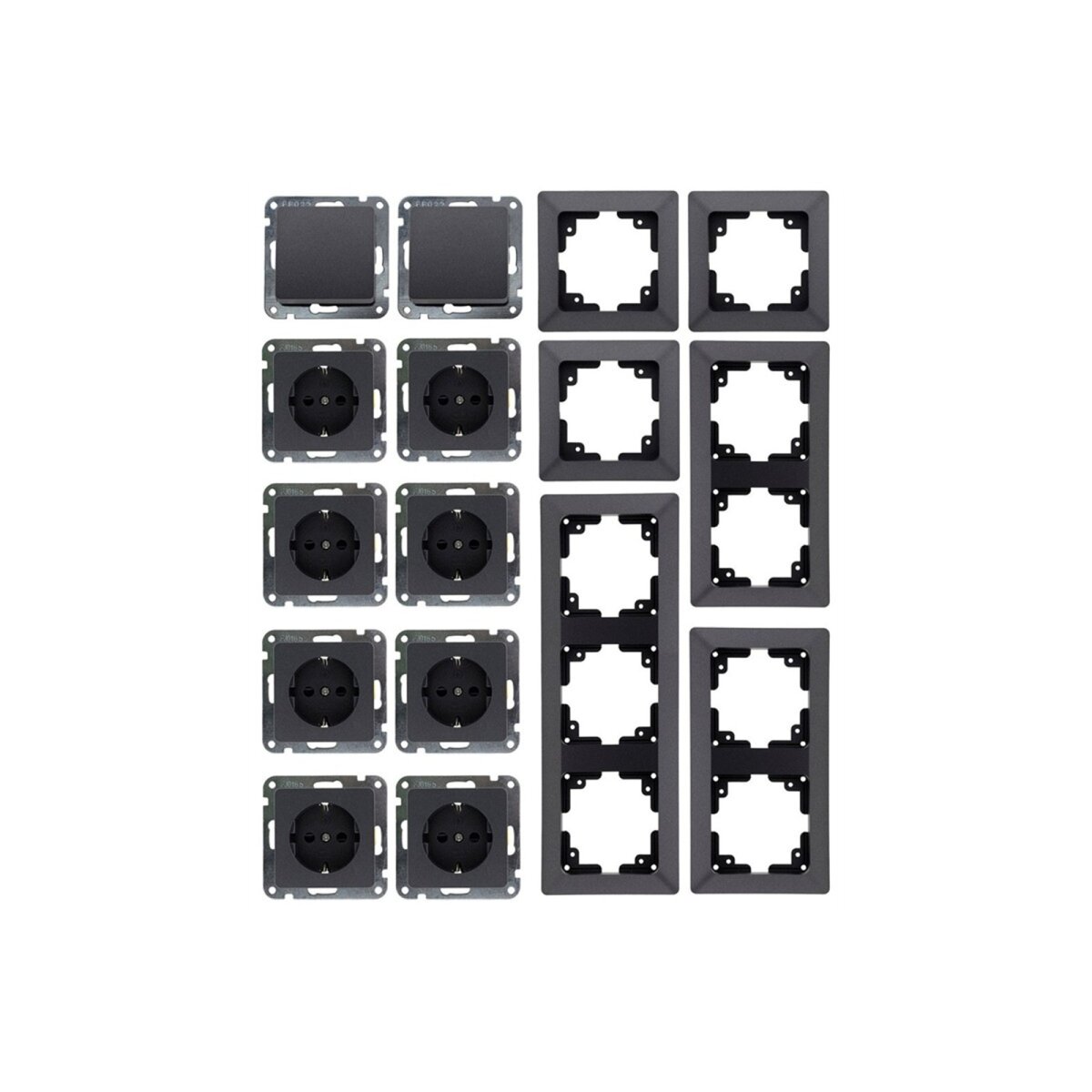 Das Set beinhaltet 8 Steckdosen und 2 Schalter mit praktischen Klemmanschlüssen für eine zeitsparende, schraubenlose Montage. Die eleganten Rahmen (1-fach, 2-fach, 3-fach) ermöglichen eine flexible Anordnung – sowohl vertikal als auch horizontal.
