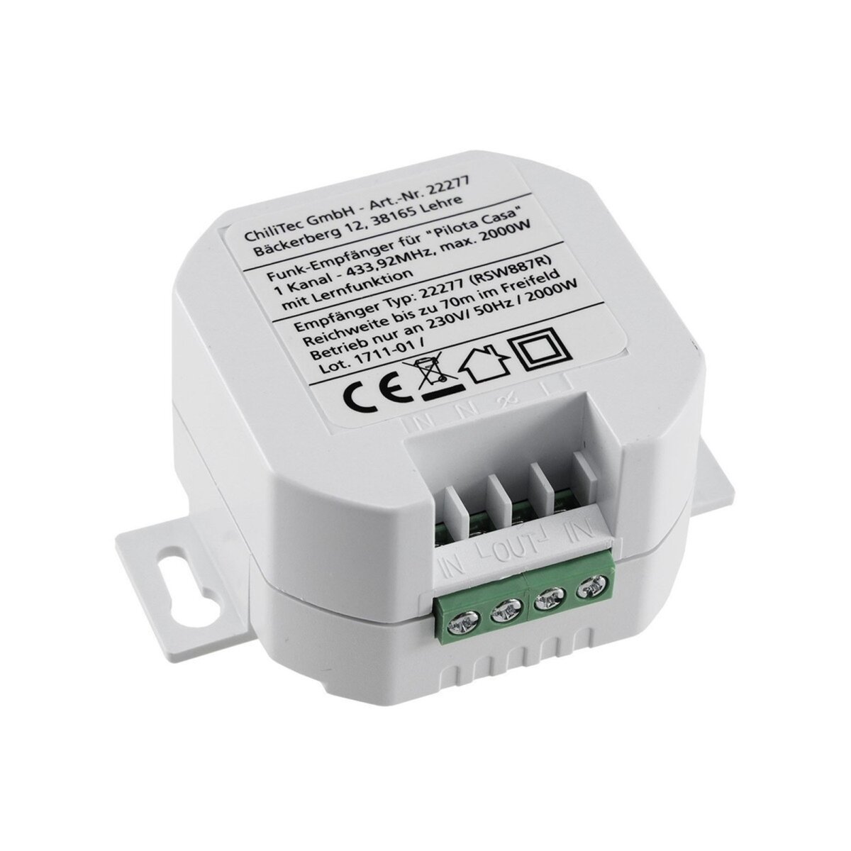 Mit dem 1-Kanal Funk-Empfänger von Pilota Casa lassen sich Steckdosen, Leuchten und andere elektrische Verbraucher kabellos schalten – ganz ohne direkte Verkabelung mit einem Wandschalter. Ideal für Renovierungen, Nachrüstungen oder Installationen in abgehängten Decken und Altbauten.