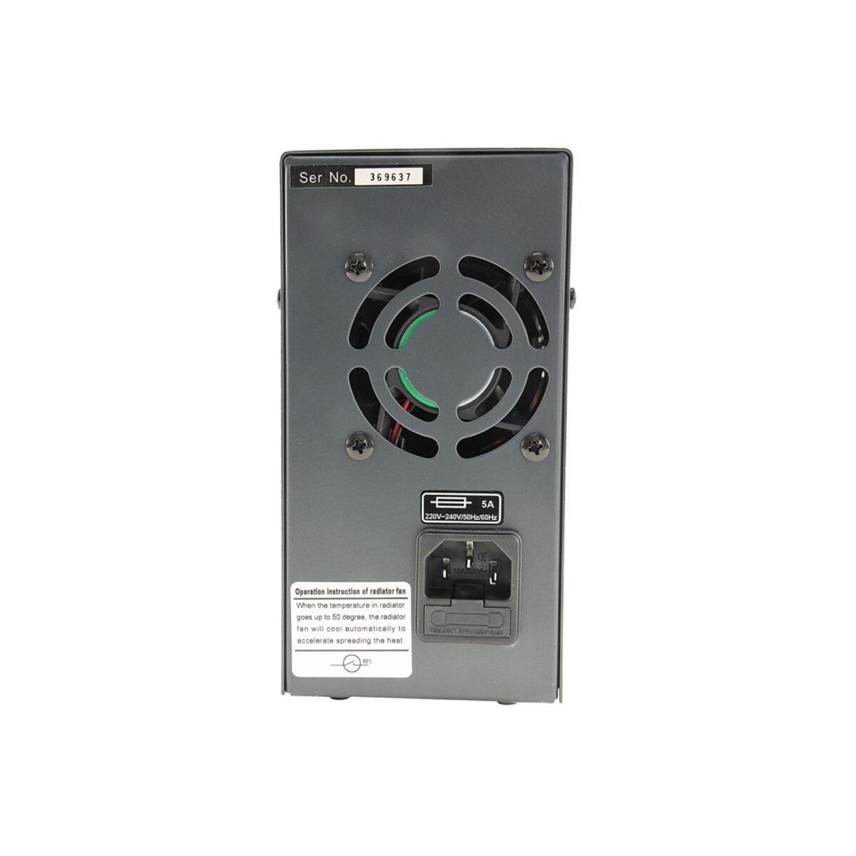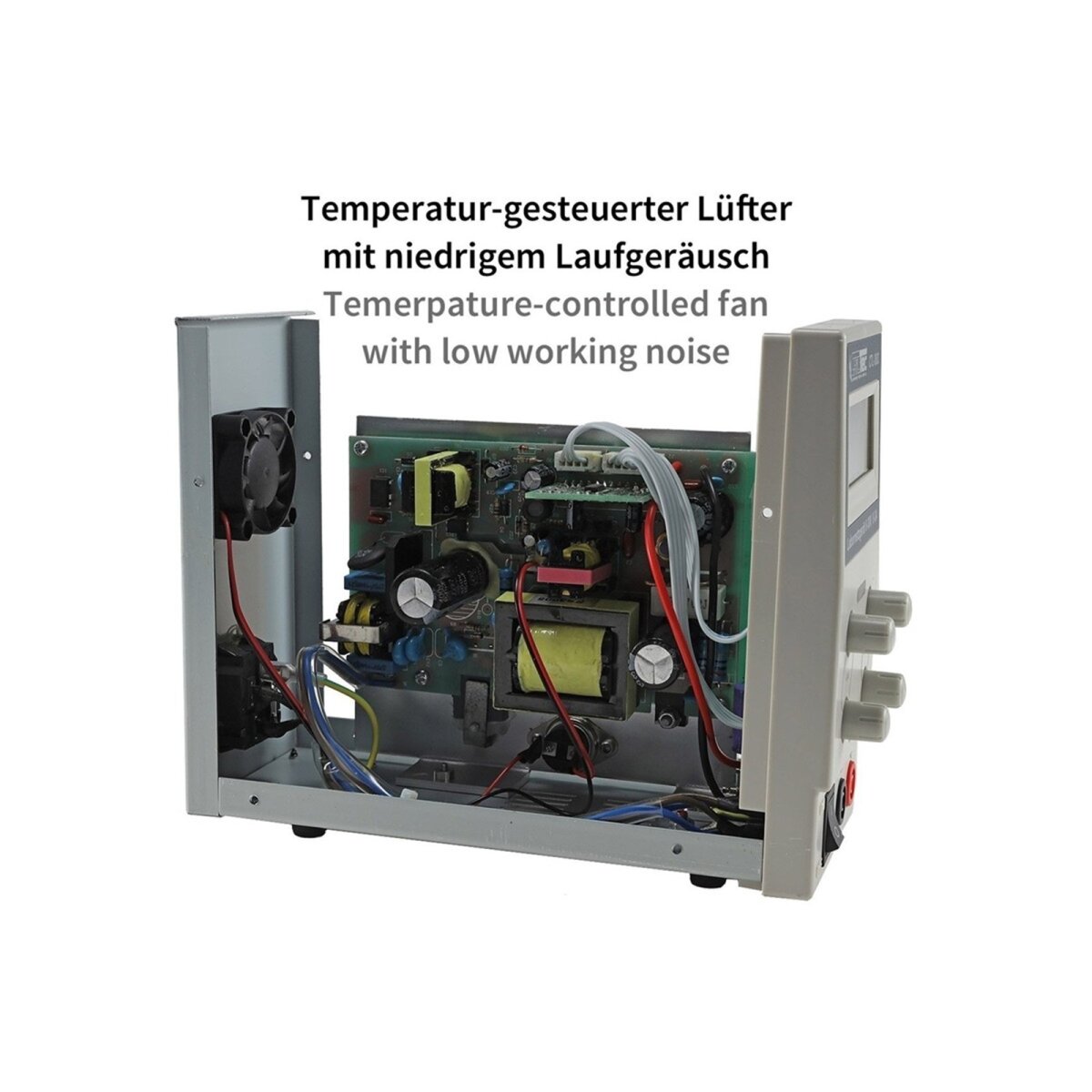 Das Gerät bietet eine große, beleuchtete LCD-Anzeige, die sowohl Spannung als auch Strom präzise darstellt. Mit einer Anzeigegenauigkeit von ± 2,5% liefert es zuverlässige Messwerte. Durch die eingebaute Strombegrenzung wird das Gerät vor Überlastung geschützt. Der temperaturgesteuerte Lüfter sorgt für eine ruhige Geräuschentwicklung und eine lange Lebensdauer des Netzgeräts.