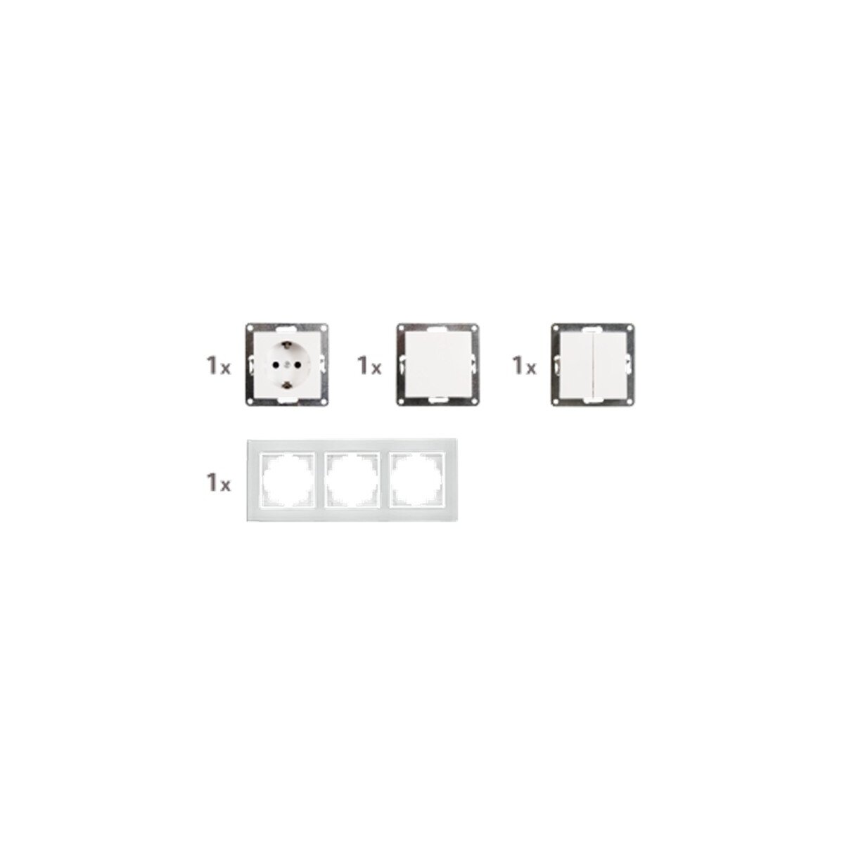 Das Set besteht aus einer Schutzkontakt-Steckdose mit erhöhtem Berührungsschutz, einem Wechselschalter sowie einem Serien-Doppelschalter. Alle Komponenten sind für die Unterputz-Montage ausgelegt und passen in gängige Hohlwanddosen mit 68 mm Durchmesser.