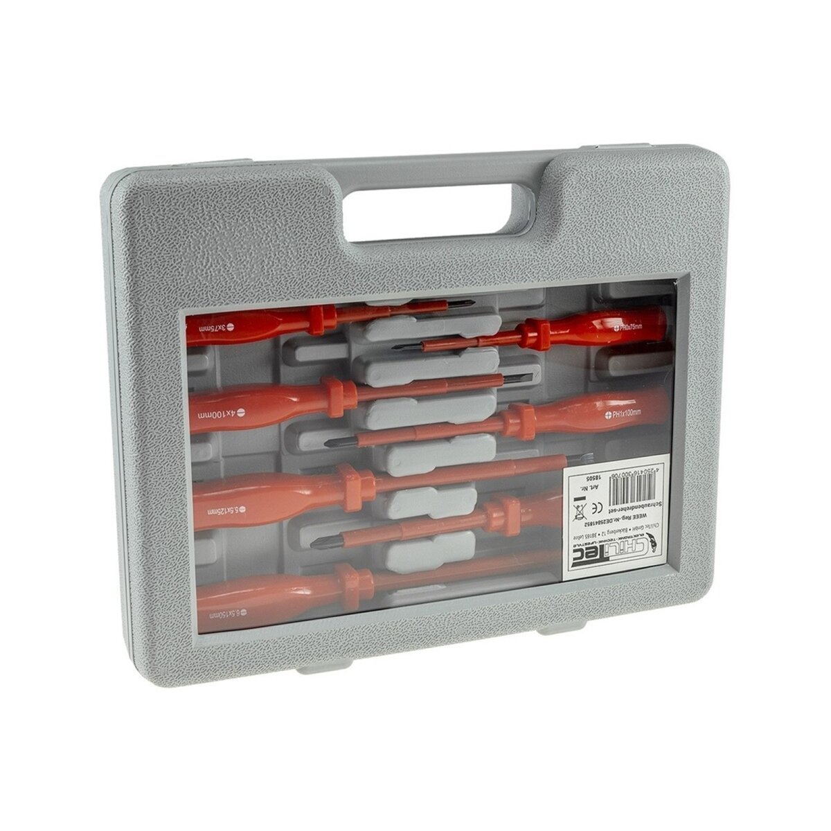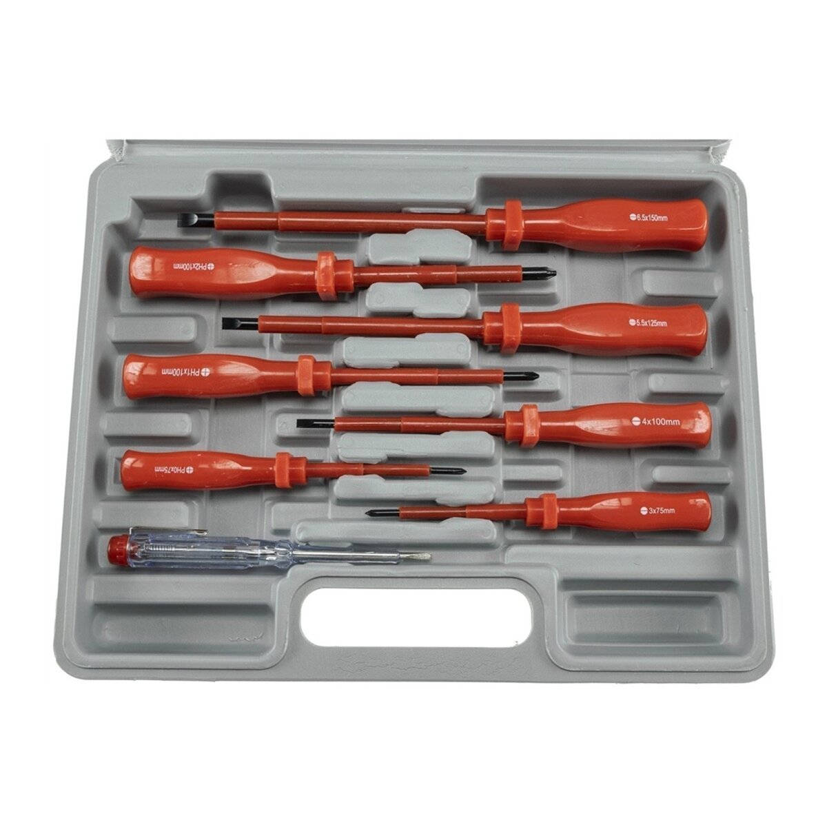 Das Set enthält eine Auswahl an Kreuz- und Schlitzschraubendrehern sowie einen Phasenprüfer – alles, was Sie für elektrische Installationen benötigen. Das Set kommt in einem praktischen Transportkoffer, der für eine ordentliche Aufbewahrung und schnellen Zugriff sorgt.