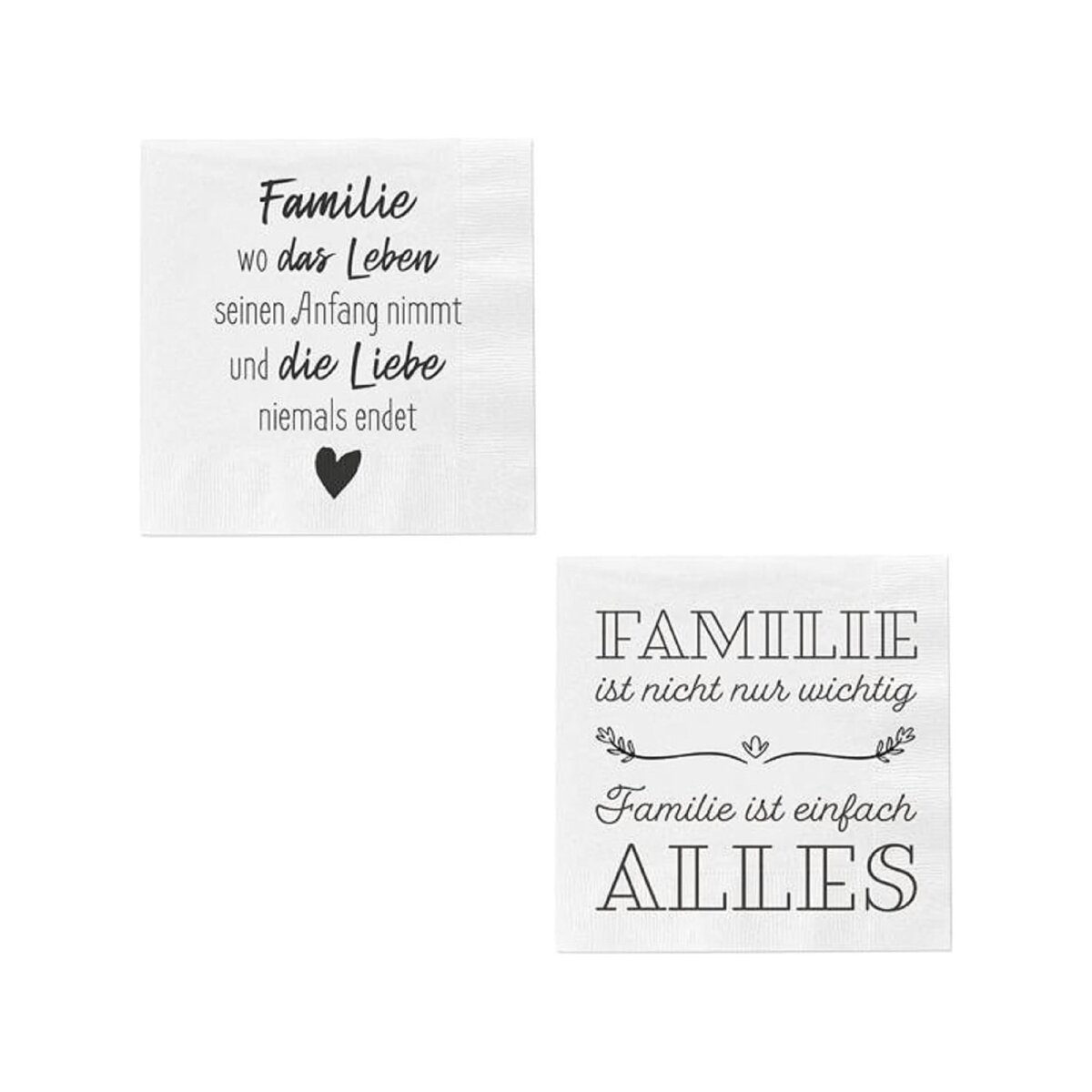 Die Servietten „Familie“ im 20er Pack sind mehr als nur praktisches Tischzubehör – sie sind eine liebevolle Hommage an das, was wirklich zählt: Familie, Zusammenhalt und Liebe. Mit ihrer stilvollen Gestaltung in Weiß und den emotionalen Aufdrucken schaffen diese Servietten eine warme, einladende Atmosphäre.