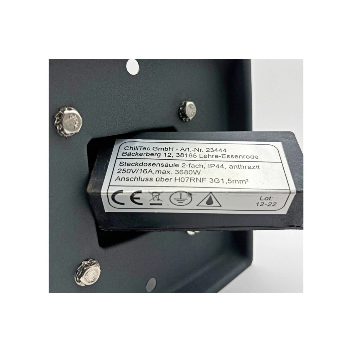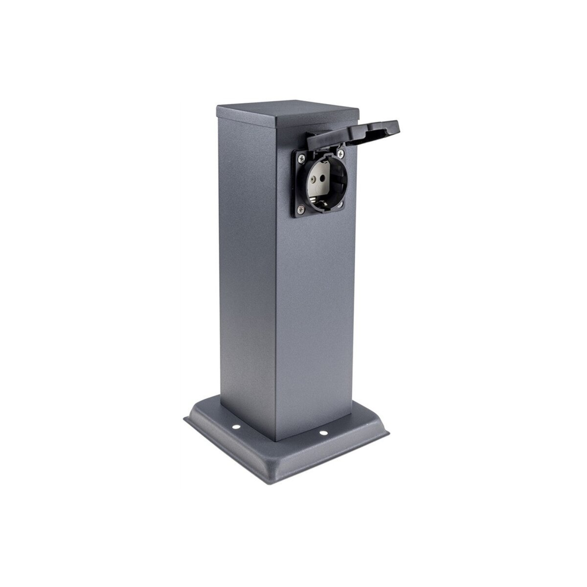 Die Installation erfolgt über eine Bodenmontage – für besonders festen Halt empfiehlt sich der passende Erdspieß (Art.Nr. 23447). Er ist speziell für diese Steckdosensäulen gefertigt und bietet sicheren Stand auch bei windigem Wetter.