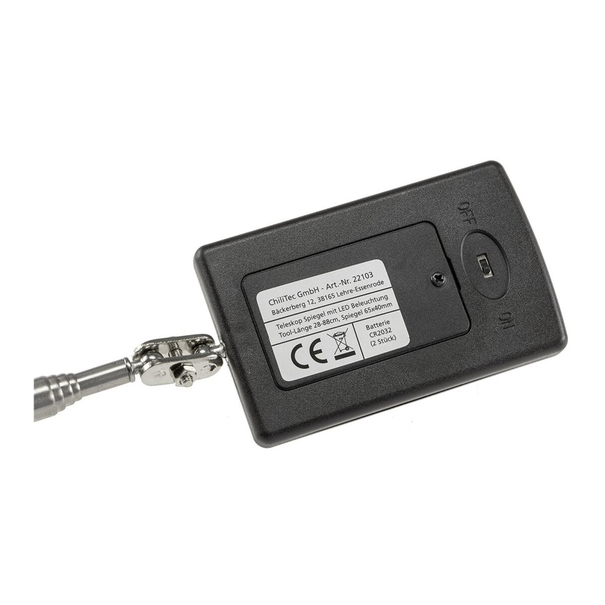 Mit dem Teleskop Spiegel mit LED Beleuchtung haben Sie die perfekte Lösung, um schwer zugängliche Bereiche zu inspizieren, die sonst im Dunkeln verborgen bleiben. Der hochwertige Spiegel (65x40mm) ist ultraflach und bietet eine klare Sicht. Dank zwei weißer LEDs wird der Spiegel auch in dunklen Ecken effektiv ausgeleuchtet. Das Teleskop ist von 28 bis 88 cm ausziehbar und ermöglicht Ihnen flexibles Arbeiten, auch in engen oder schwer einsehbaren Bereichen. Der Softgriff sorgt für einen sicheren Halt während der Anwendung. Mit zwei 2032 Knopfzellen (im Lieferumfang enthalten) ist der Spiegel sofort einsatzbereit.